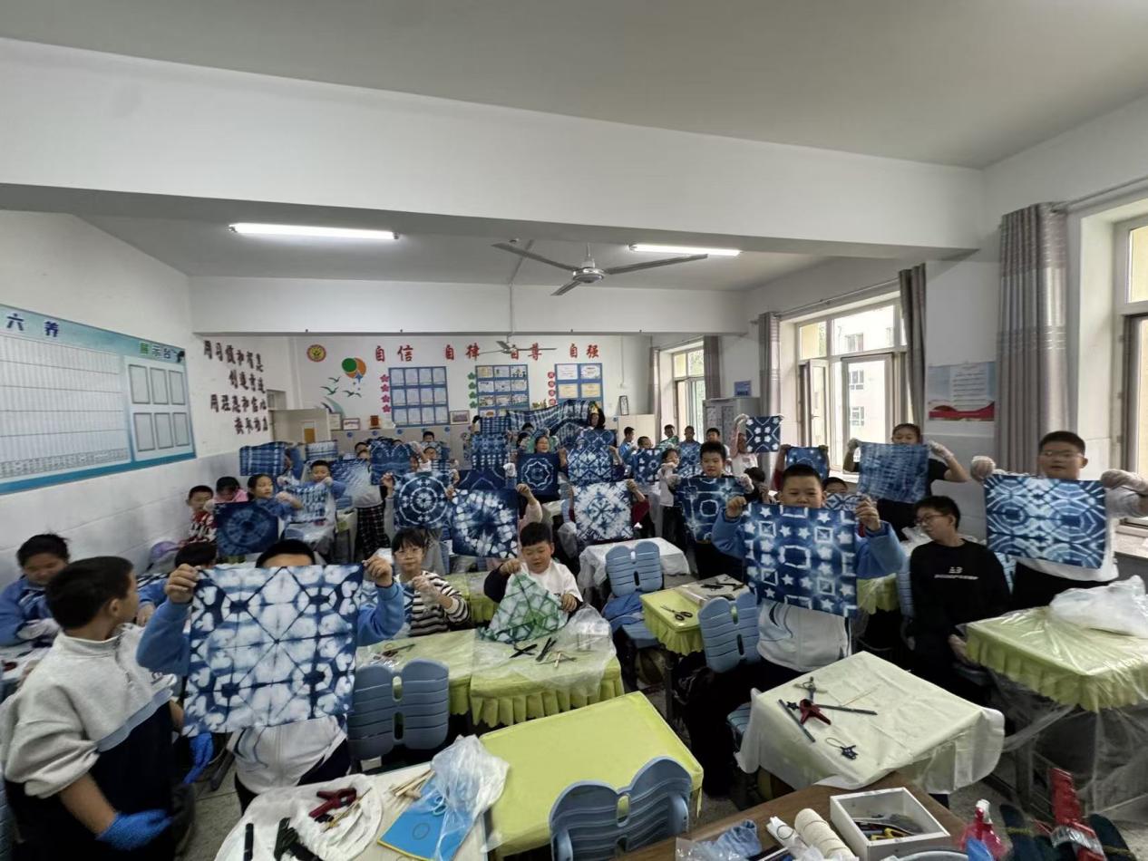 课堂上,同学们全程投入,兴致盎然。当小心翼翼地解开捆扎的线绳,看到一件件色彩斑斓、图案各异的扎染作品呈现在眼前时,惊喜与自豪洋溢在每个人的脸上。老师也为同学们的创意与巧手点赞。师生们纷纷展示自己的作品,合影留念,温馨的画面定格了非遗传承的美好瞬间。